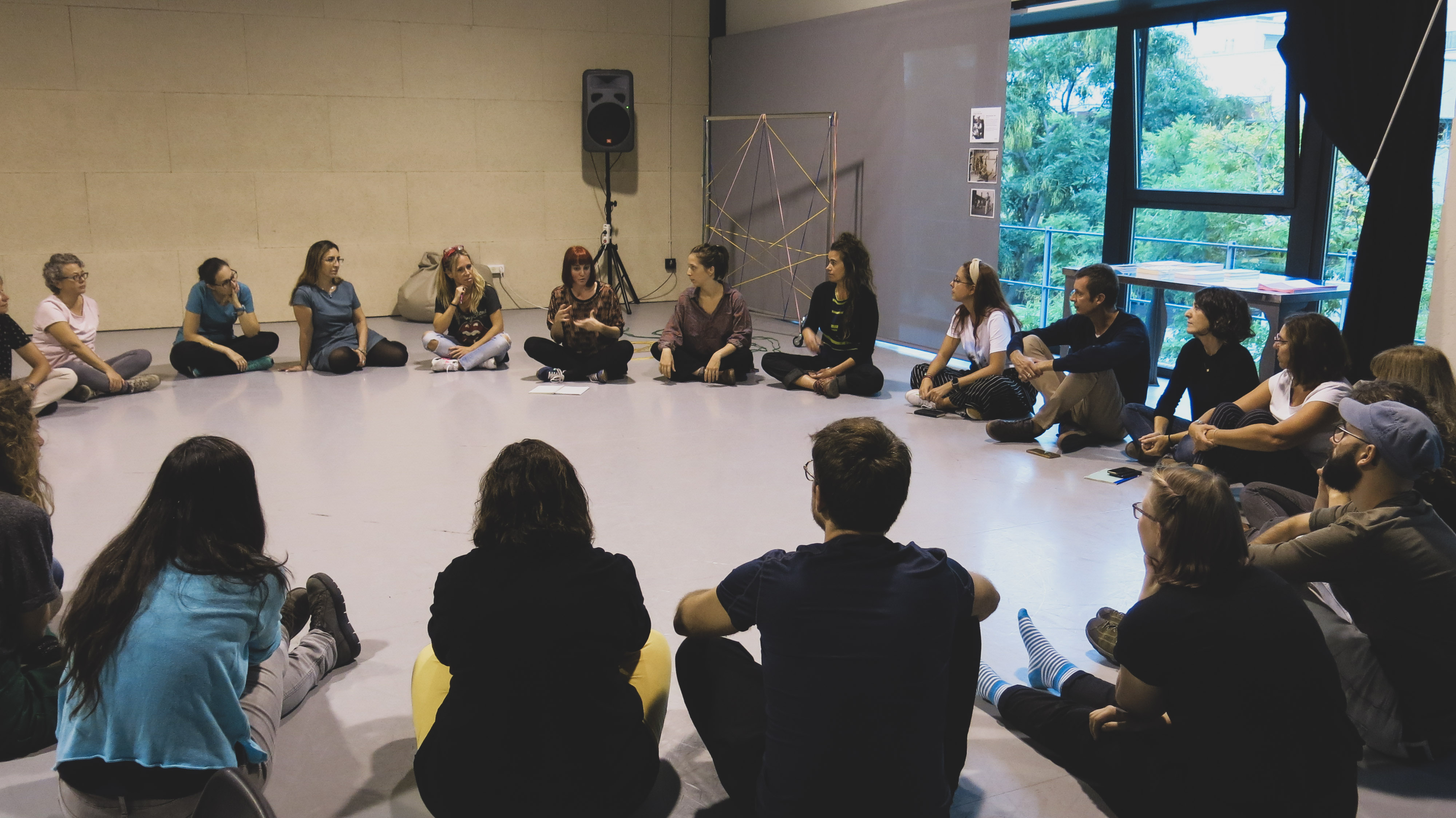 Ens agradaria reprendre la imatge dels string games1 de Vera Frenkel per a repensar la mediació com un espai on entreteixir col·lectivament els llenguatges de l'art i l'educació. Entre el joc, l'escolta i la provocació aquesta imatge ens revela la mediació com una coreografia inesperada de moviments, posicions, maniobres i visions que es tiben, s'entrecreuen i es componen en un exercici compartit. Amb aquesta metàfora coreogràfica ens agradaria convidar-vos a entrar en una zona de contacte i ressonància on les pràctiques artístiques i pedagògiques es funden per a crear un espai híbrid i mutant on imaginar altres maneres de fer art o educació.